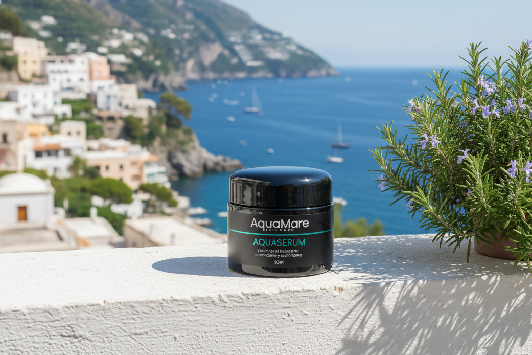AquaMare Skincare da vida a AquaSerum. Una fórmula concentrada que combina ingredientes botánicos como el romero con activos biotecnológicos de alta eficacia —como el ácido hialurónico, el colágeno marino, los péptidos y la ectoína— para hidratar en profundidad, proteger frente al estrés ambiental y revelar una piel más firme, luminosa y revitalizada.